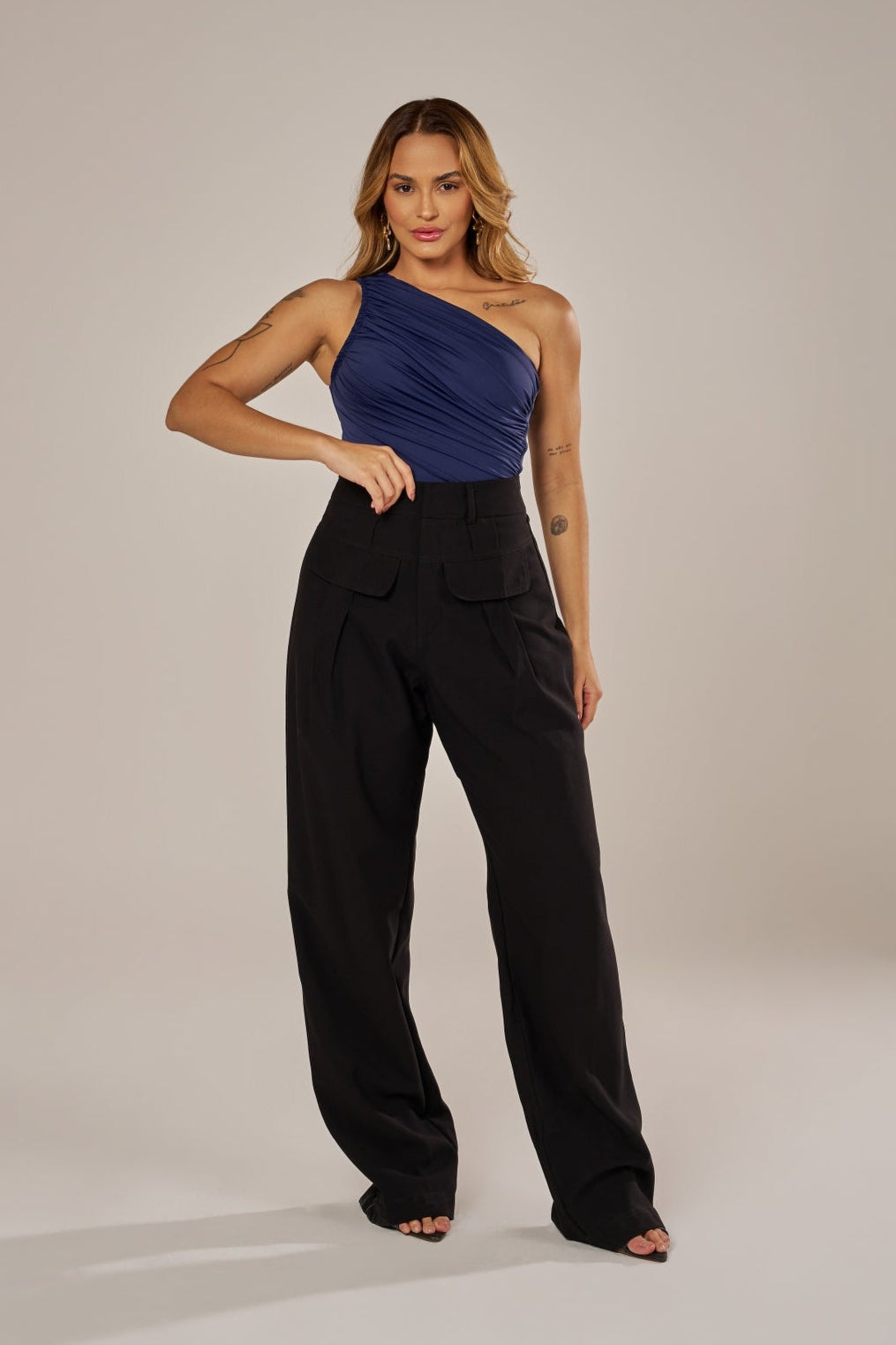 A calça em modelagem reta é confeccionada em alfaiataria de viscose, garantindo caimento impecável. O modelo se destaca pelas maxi pregas frontais e pelas lapelas decorativas que adicionam um toque de estilo diferenciado. O fechamento em zíper e colchetes mantém o visual elegante e funcional.